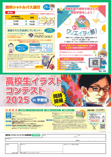 📌水戸駅より無料シャトルバス運行 📌入場登録制 📌自分の作品を持っていくと大学の先生が講評してくれます! 📌高校生イラストコンテスト開催!