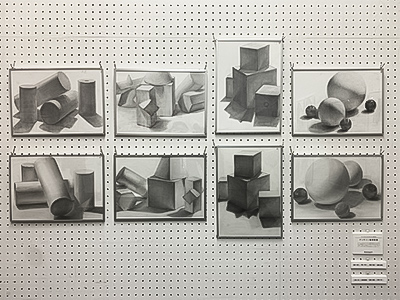 2年次 は、ポスターや立体模型、ロゴマークなど、具体的なデザインの実習が始まります。コンピュータを使った実習やデッサンなどの技術レベルもグッと上がります。