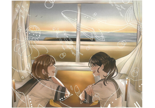 私は学校の放課後の教室がエモいなと思いました。何の話をしているのか絵の中の女の子2人の秘密と言う設定で描きました。