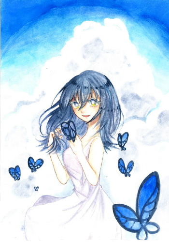 青空を背景にした少女の絵をかきました。少女が独りになっても蝶だけは味方でいるでしょう。