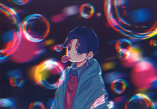 夜に舞うしゃぼん玉、それを見つめる風船ガムを膨らませる1人の少女