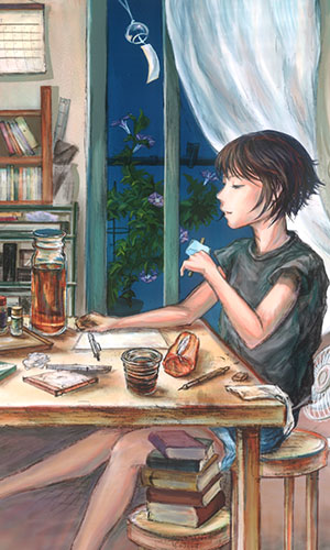 セミの声、網戸の匂い、扇風機の音など色々なものを感じられる夏の夜を描きました。