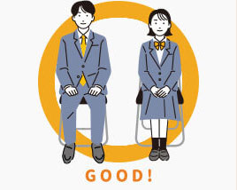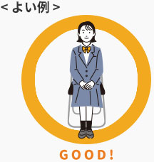 着席する時はイスに深く座らずに体と背もたれの間に握りこぶし1つ分の隙間を開け背筋を伸ばして座ると姿勢がよく見えます。